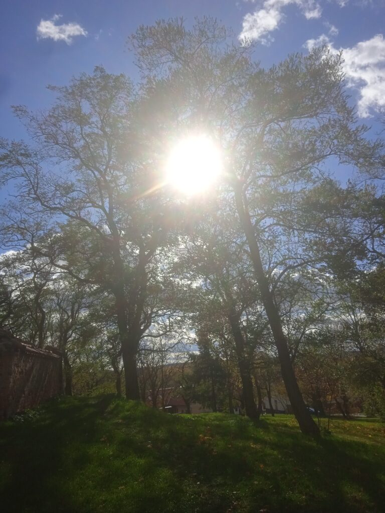 Pozoruhodný románsko-gotický kostel sv.Jiří v Hradešíně, který vlastně leží už blíže ku Praze než ke Kolínu jsem navštívil za velmi větrného podzimního dne, což cestování (s holí, kloboukem a mobilem v ruce) poněkud ztěžovalo. Nedělní bohoslužba, během níž jsem si naplánoval příjezd, byla však velice krátká – po půlhodině bylo vše odbyto, a já jen tak tak stihl vklouznout dovnitř, když už kostel zavírali a nic jsem tam nenafotil – ono by ani nebylo moc co, kromě kleneb. Úplně postačí vnějšek kostela, který je jaksi dvojhlavý.