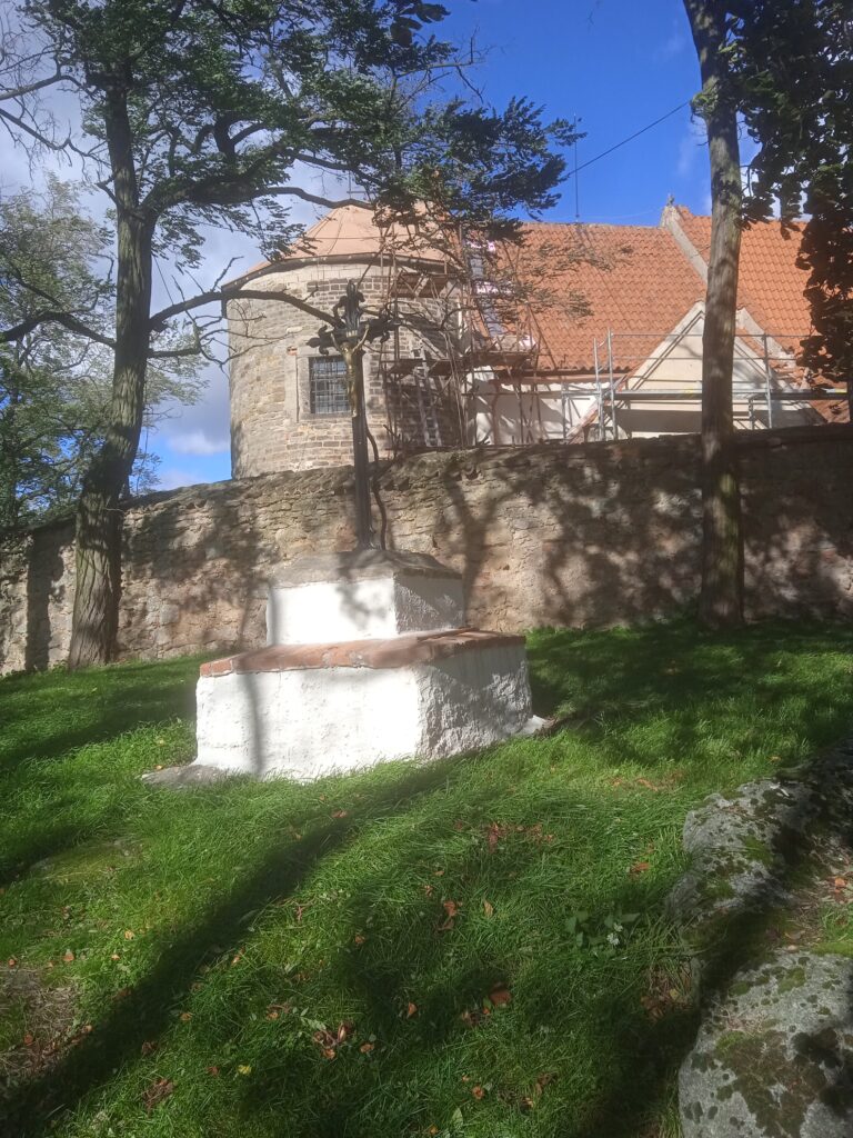 Škoda jen, že se ta rotundální část vůbec nevyužívá, jen jako jakési odkladiště, a taky trochu škoda toho velkého okna prolomeného do pláště rotundy. To je vidět z jihu, kde je také vchod s křížkem a překvapivě též renesanční, neb raně barokní vnější kamenná kazatelna – velmi pěkná.