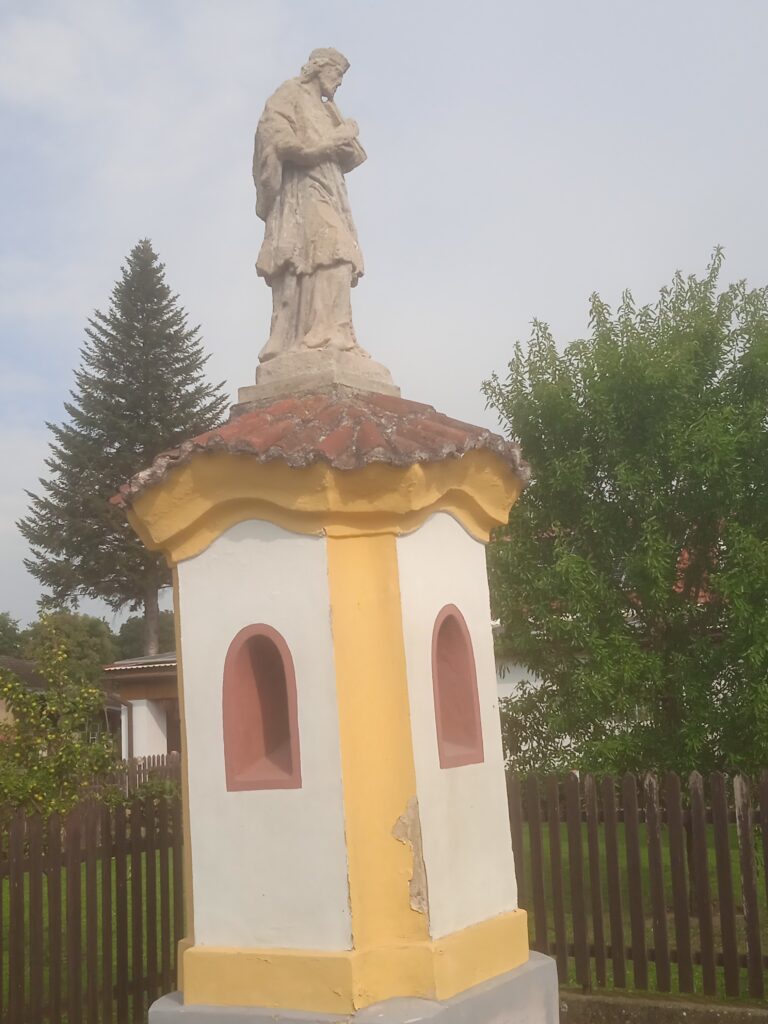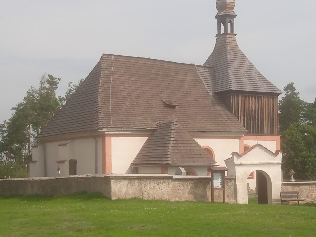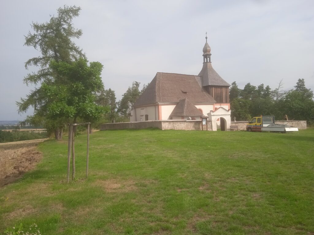 Nuže, říkáte si, kde je ale ten slibovaný kostel, kvůli němuž nakonec tuto výpravu podnikáme. Vypadá to, jako by tu vůbec nebyl. – Pravdu díte. Ve vesnici skutečně není, ale dost daleko od ní na vršku, jehož jedno úbočí je v současnosti dokonce nějakou přírodní rezervací. On tento kostel vlastně nikdy k vesnici přímo nepatřil; založili si ho v onom 16.století vlastníci panství, tehdy Salavové z Lípy, jakožto svůj patronát a pohřební kapli. Proto také je na předchozí tabuli zmínka, že místní chodívali do kostela v Třeboníně (viz zde Třebonín).