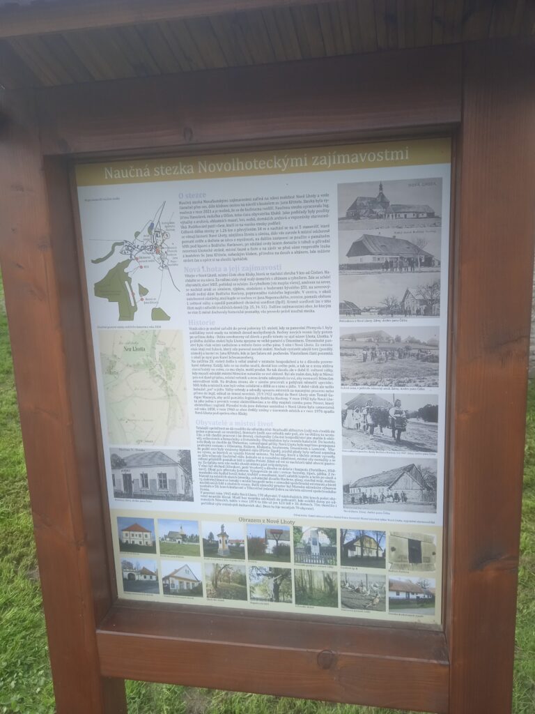 Ještě jedna válka se Nové Lhoty významněji dotkla, a to válka s Napoleonem: svědčí o ní malý francouzský hřbitůvek s křížem při cestě ke kostelu – ten jsem nevyfotil, ale máme ho tady na této tabuli mezi malými fotografiemi dole.