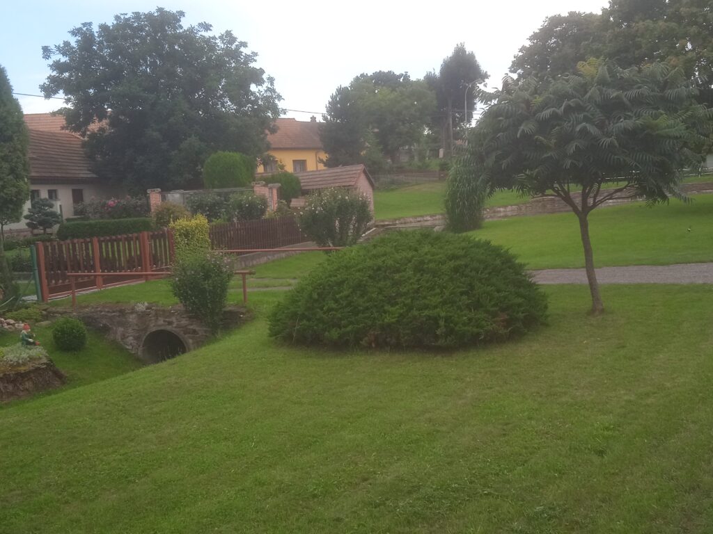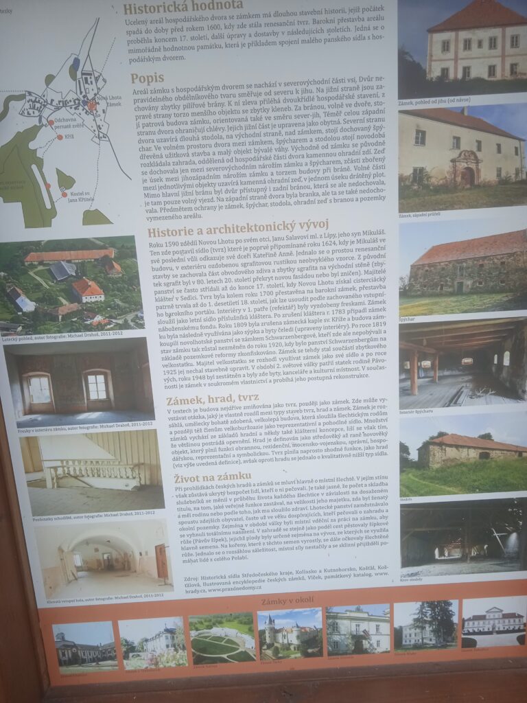 Jak vidno, záme(če)k je sice poněkud zanedbaný, ale opravuje se, a jistě bude brzy krásný. Popisovat ho více nemusím, neboť to za mne udělá lépe informační tabule umístěná opodál (tedy jedna z vícero informačních tabulí umístěných v obci, které jsou šmahem výborně zpracované, uvádějí spoustu zajímavých podrobností a ještě je zde využijeme.