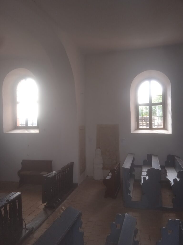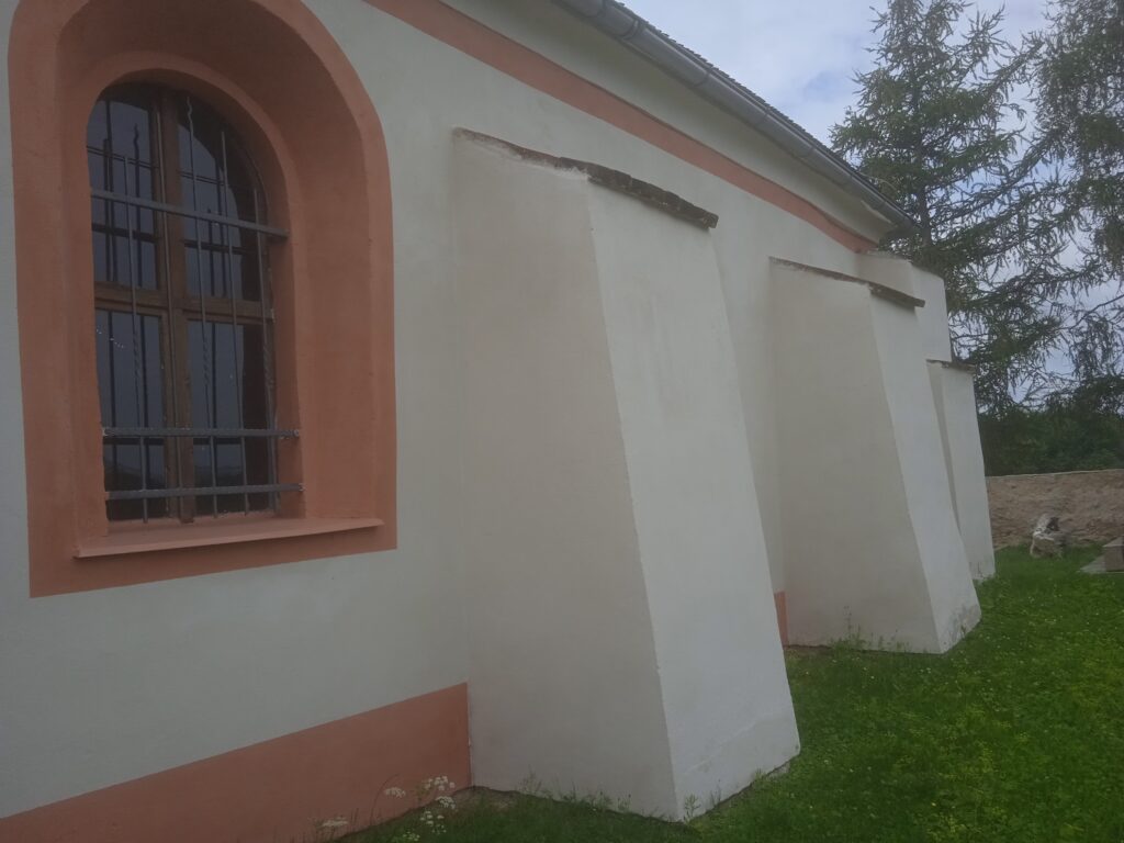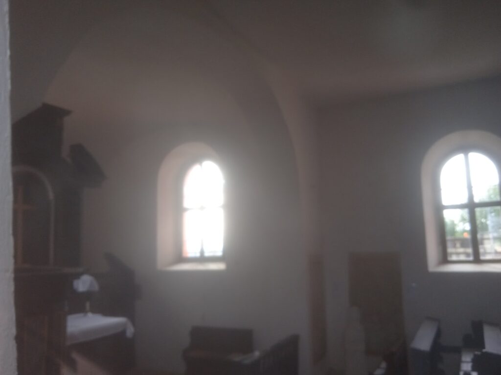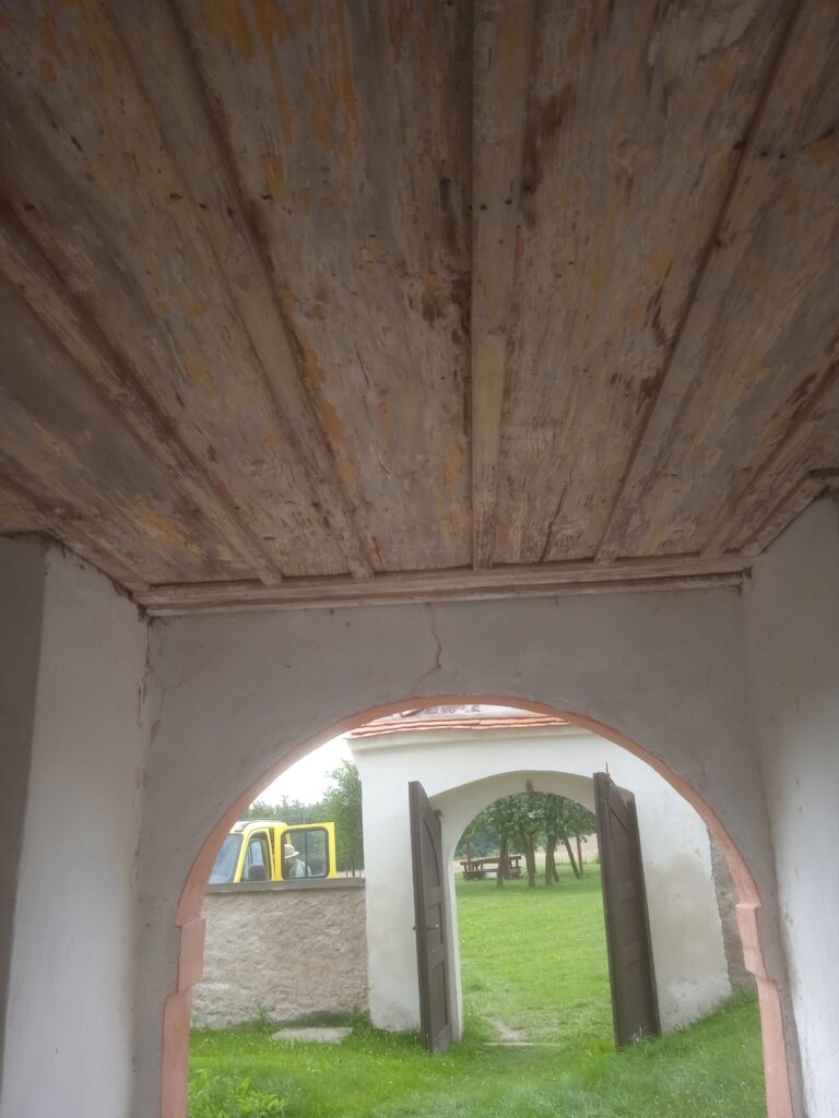 Kostelík je dost nízký, takže při jeho obcházení vidíme nejen zajímavé vnější detaily, ale máme možnost i nahlédnout dovnitř poměrně nízko posazenými okny z běžného skla.
