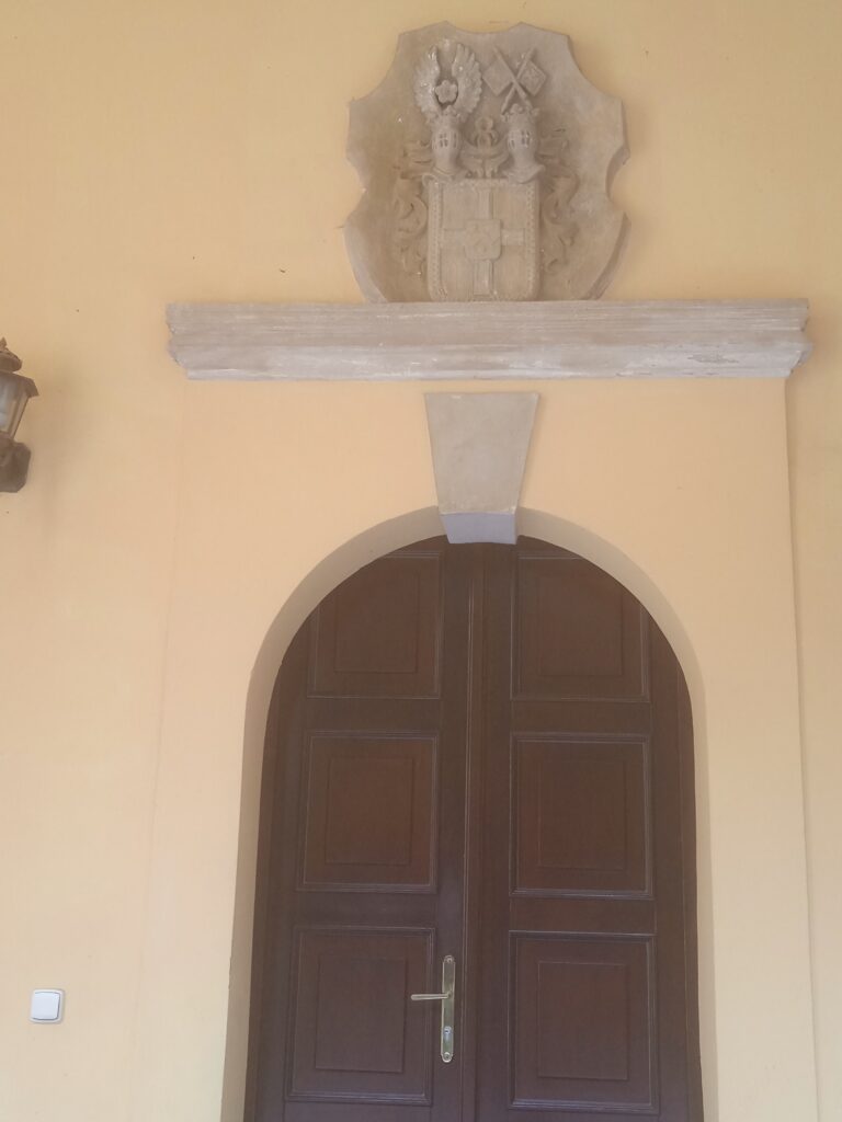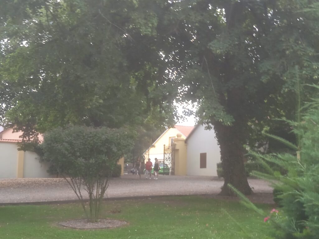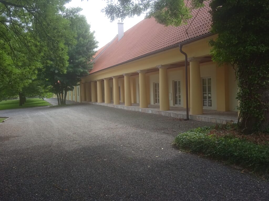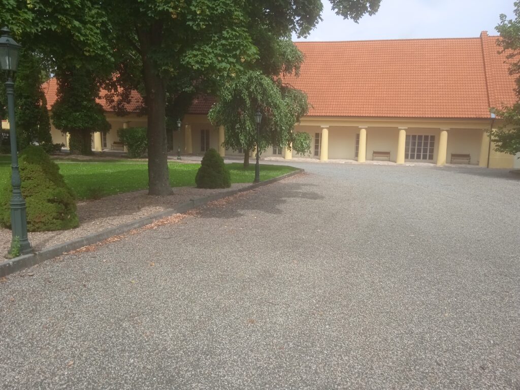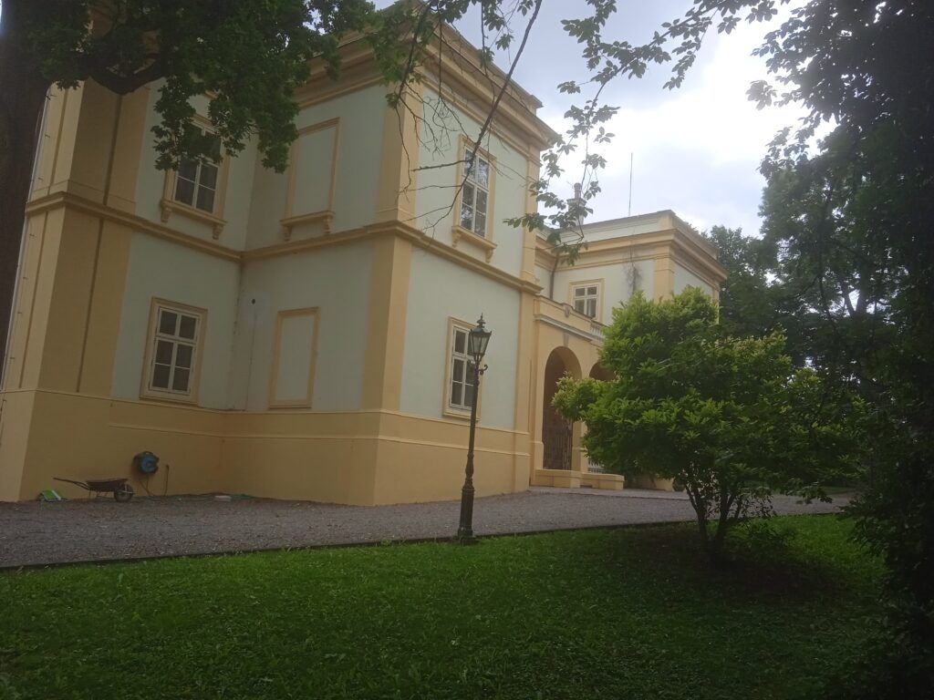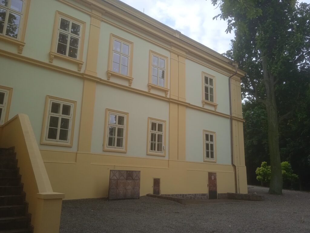 Úmonínský zámek je z úplně jiného těsta, než ten starý,  vlastně ještě renesanční v Nové Lhotě. Je mladší, původem barokní, ale ještě novoklasicistně přestavěný v 19.stol. A hlavně oproti konkrétní rustikální živosti, jakou cítíme v Nové Lhotě, zde je všechno vyčištěné a vypravoúhlené. Celý poměrně velký objekt je v soukromých rukou – jedné kutnohorské firmy. V jednom zahradním křídle sídlí útulek pro kočky, což je instituce v kraji pochopitelně poměrně populární.