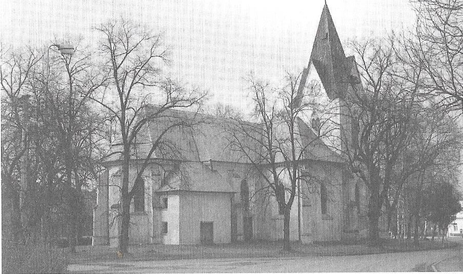 Je to trochu moje chyba. Kostel, jak vidíte, halí skoro ze všech stran krásné, mohutné stromy, a já mezi nimi nenašel úhel, abych vyfotil celou východní frontu kostela, v té bujné srpnové vegetaci to skoro nešlo. Proto si na tomto místě posloužím fotografií ze zmíněné publikace, kde jsou stromy holé, ale ani na ní nic neprozrazuje, že by východní fronta kostela, byť členitější, v sobě někde skrývala původní presbytář.
