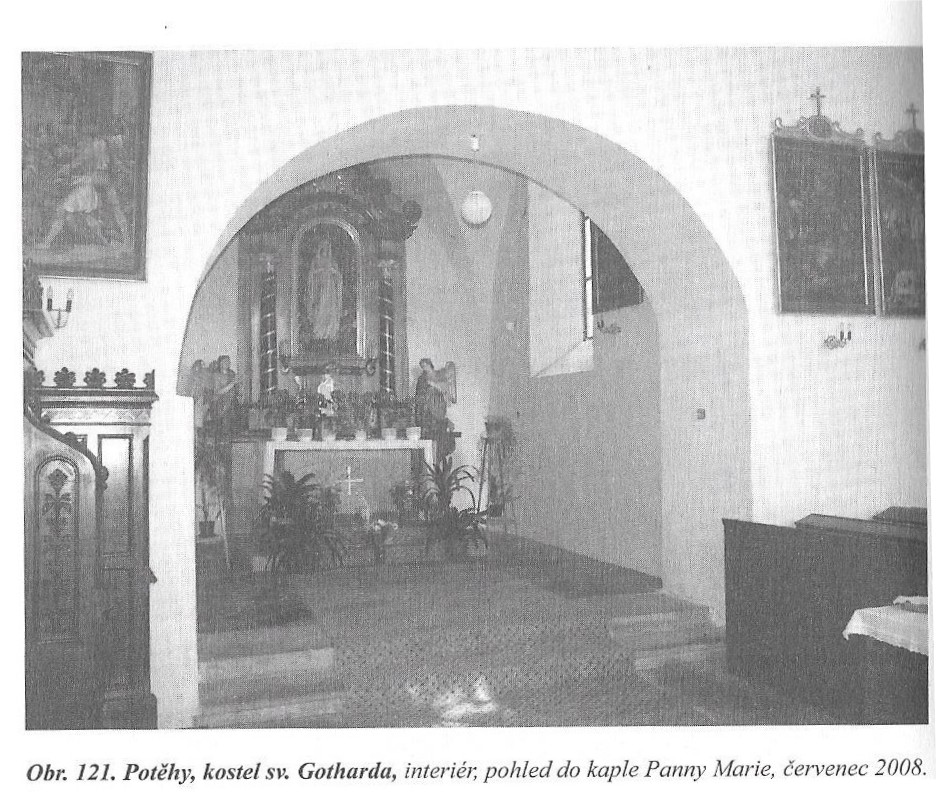 Kostel sv.Gottharda v Potěhách klame tělem: Co na něm vypadá staré, je nové, a co vypadá nové, je – v některých případech – staré. Staré tak nejsou gotické opěráky, jež rytmizují celou západní stěnu kostela, …