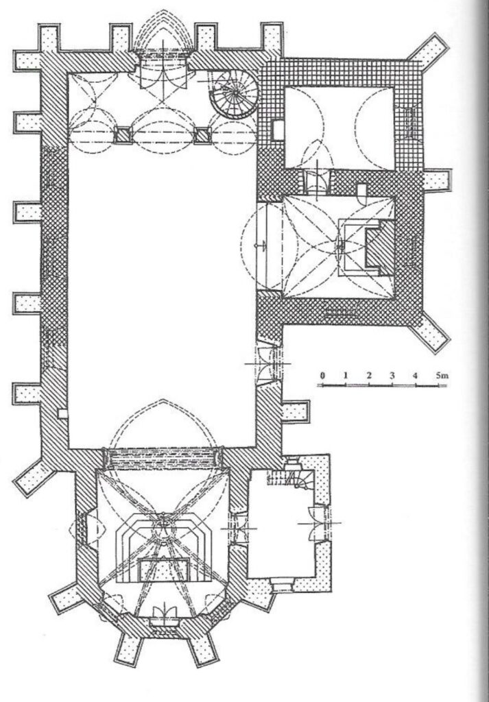 Pro uvedené schéma platí zhruba, že čím černější šrafování, tím je zdivo starší. A všechny ty opěráky jsou tak jen parádička přistavěná v 19.století spolu s novou sakristií, která snad jediná přiznává barvu a netváří se starší, než je. Pěkně ji vidíme na tomto pohledu od jihovýchodu.