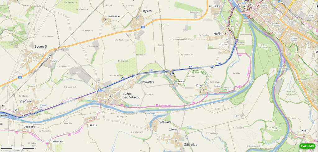 Trať Vraňany – Lužec ovšem má něco, co jí neumožňuje tak lehce, škrtem pera zrušit jako ostatní podobné. Řekli jsme, že Lužec leží na onom „Mělnickém ostrově“ a hlavní trať pochopitelně vede mimo něj. Musí tedy, aby dospěla do svého cíle překonat právě onen mělnický plavební kanál, a to po mostě. Ovšem protože je to moct přes kanál, je to most zvedací. A takováhle investice se nerada odepisuje. Na obrázku ho vzadu jen letmo tušíme (nešel jsem až k němu) a před ním už jasněji vidíme železniční zastávku, která byla v posledních letech provozu zřízena místo rozlehlého nádraží s nádražní budovou v popředí, jehož již nebylo potřeba. (Proto jeho prostor hbitě zabrala parkující auta :/ )