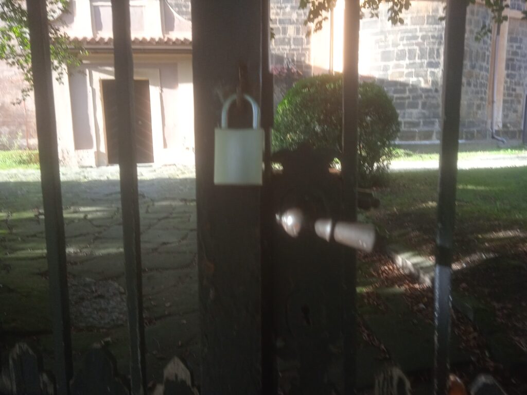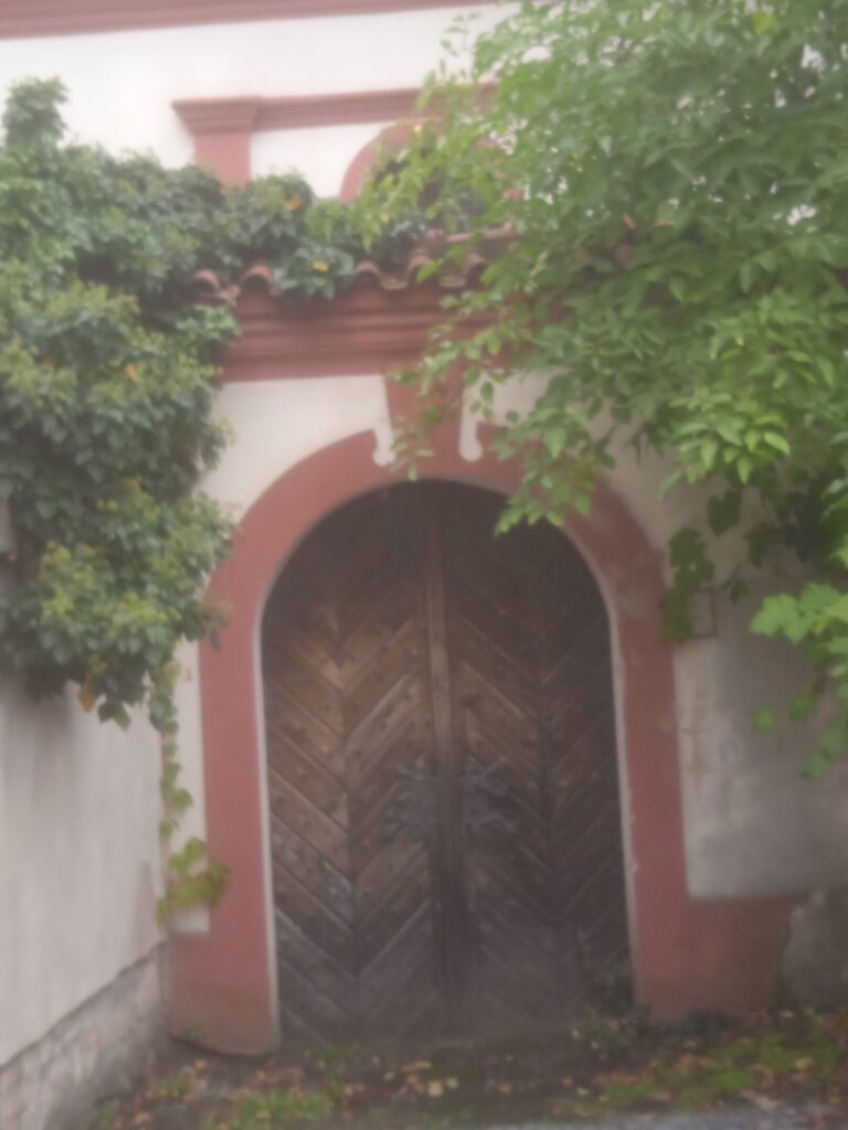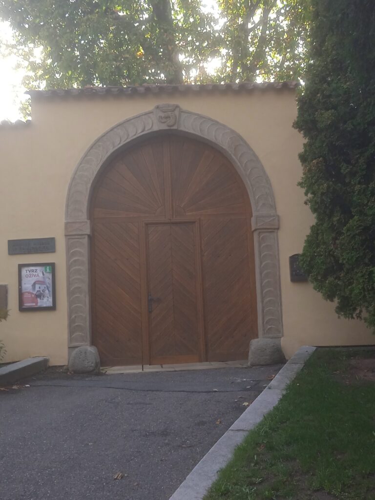 …která nás vyústí u brány čelákovické tvrze. Ta je sice na obrázku zavřená, ale podle všeho někdy bývá otevřená, neboť je tam muzeum a konají se tam kulturní akce. – Zatímco, jak je to s otevřeností hned vedle stojícího – památného, z velké části románského! – kostela, bych ruku do ohně nedal. Myšleno ovšem také v přeneseném smyslu.