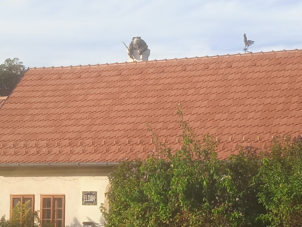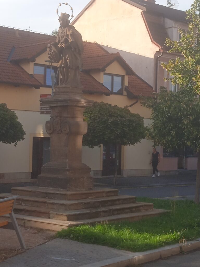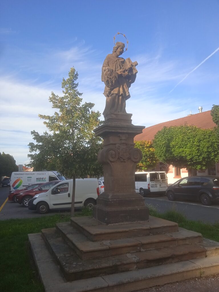 Čelákovice už další církevní stánek (kromě ne moc pěkného husitského kostela) nemají. Mají ale pěknou svatojánskou sochu, kterou je ale dost obtížné zachytit na obrázku, neboť se okolo ní rozkládá – parkoviště a prohánějí se kolem ní auta.
