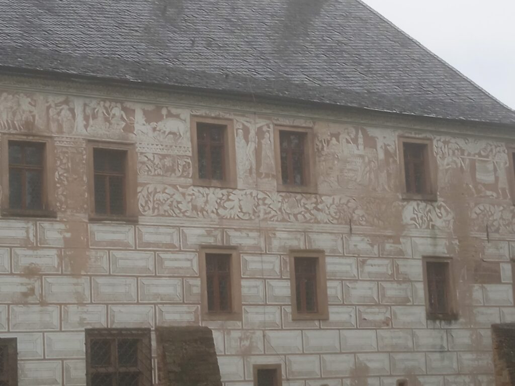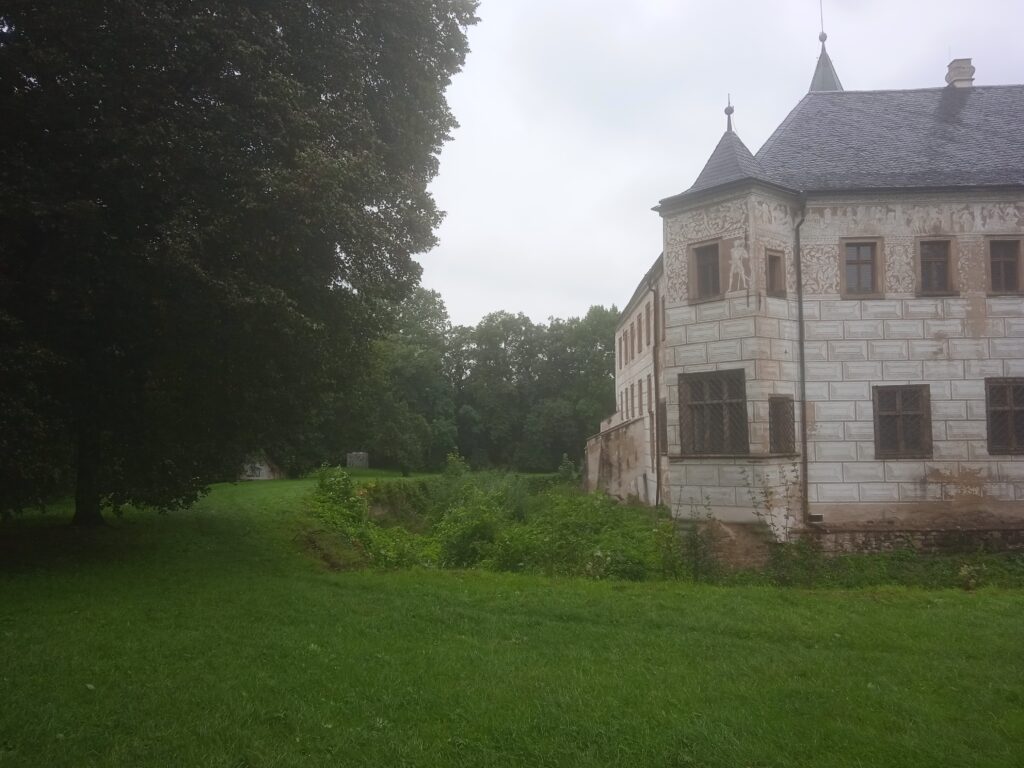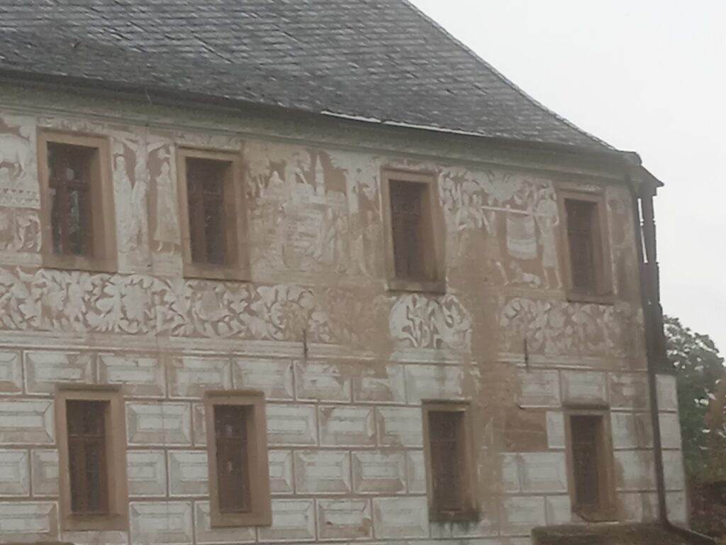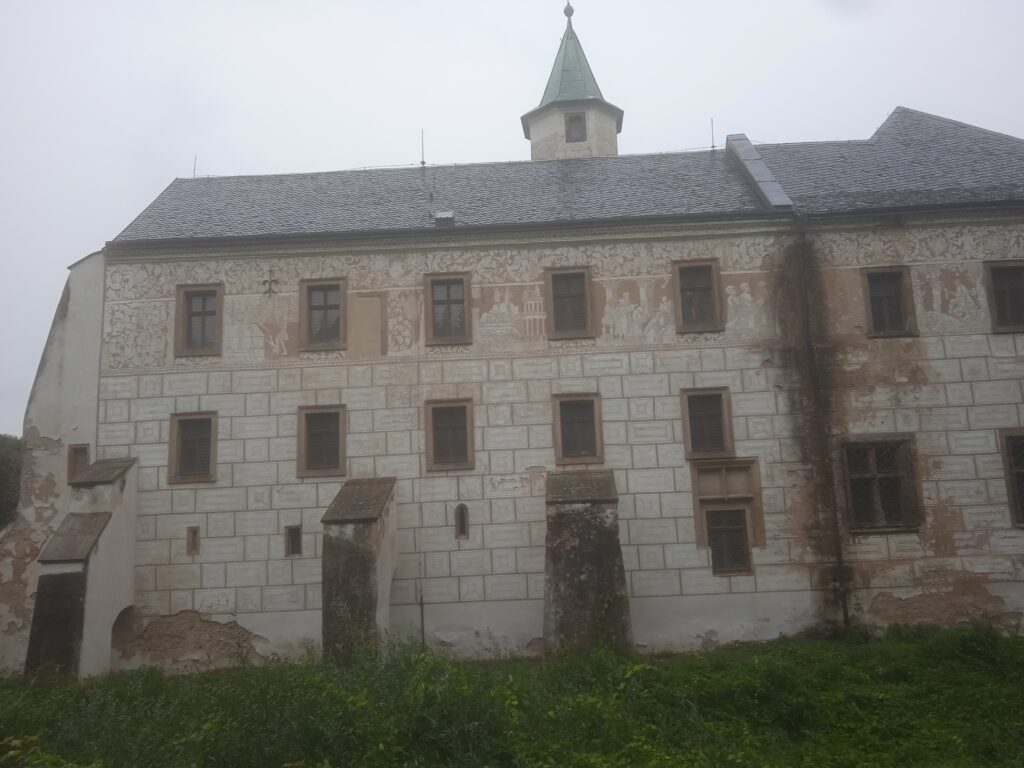 Zámecká fasáda není v nejlepším stavu – sgrafita (a jsou tam i figurální) by si věru zasloužila opravu: