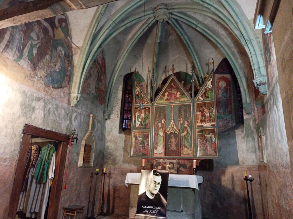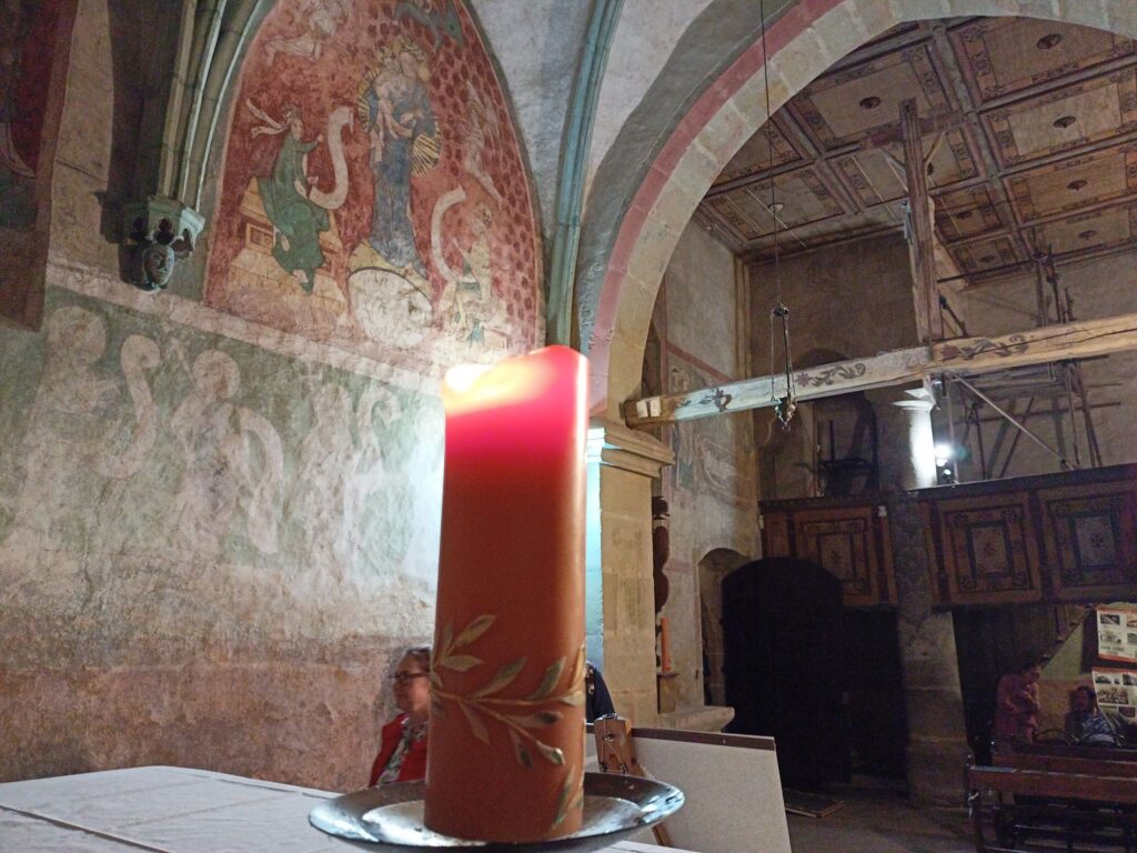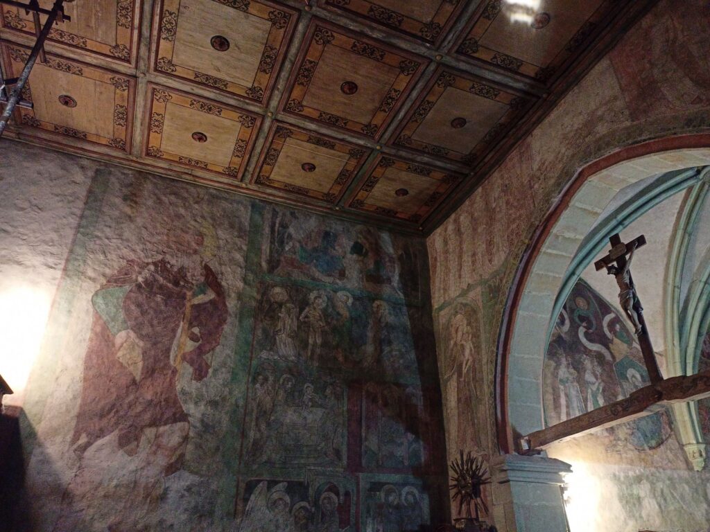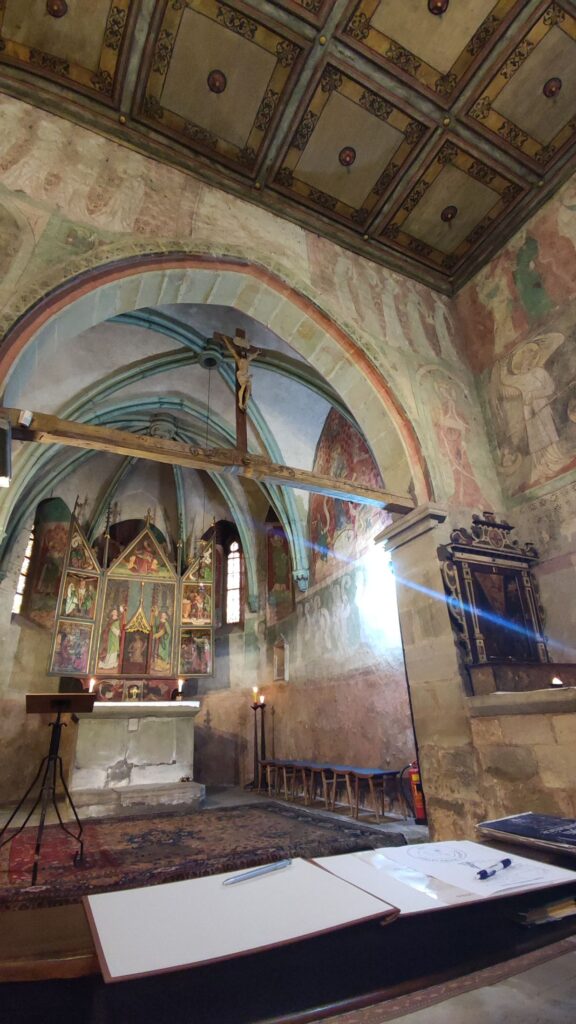 Tam vás přivítá úchvatný interiér, plný barev, světel a stínů – pravý středověk se vším všudy. Dalo by se o něm psát hodiny, ale lépe bude řídit se názvem tohoto oddílu mých putovních zápisků a zmlknout…