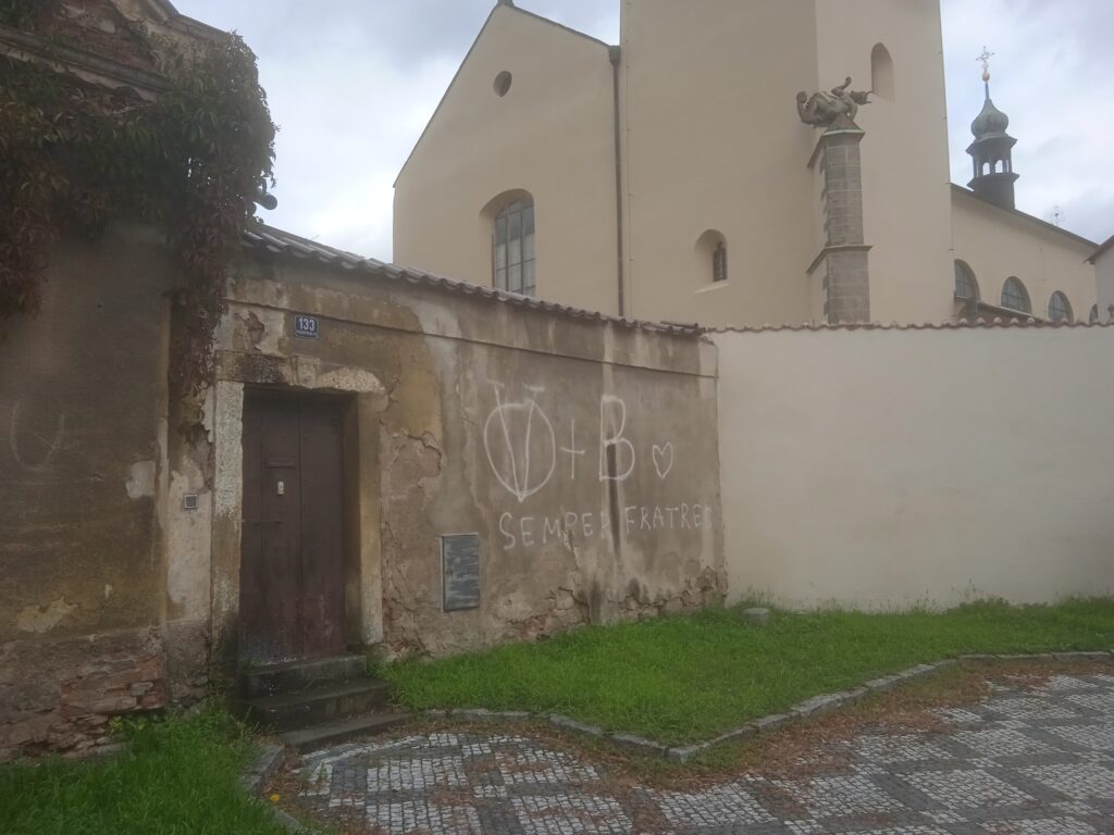 Á propos – když jsme u těch „krvavých křtin“. V novější době se objevují historické spekulace – a vlastně se objevovaly od konce 19.století, kdy se vedl velký spor o pravost svatováclavských legend – o tom, který politický kurs byl lepší a více prospěl české zemi, zda Václavův, který oslňuje svoji čistotou a mravní silou, nebo Boleslavův, který koneckonců úspěšně řídil český stát po několik dalších desetiletí. Nevím, není-li jejich odrazem také zvláštní „agitační“ nápis, který jsem objevil u jedné branky do areálu.