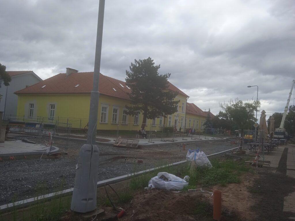 A další zajímavá školní budova: tentokrát v Komenského ulici (která je na obrázku silně rozkopaná).