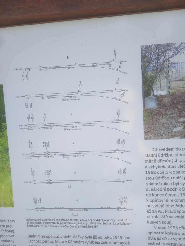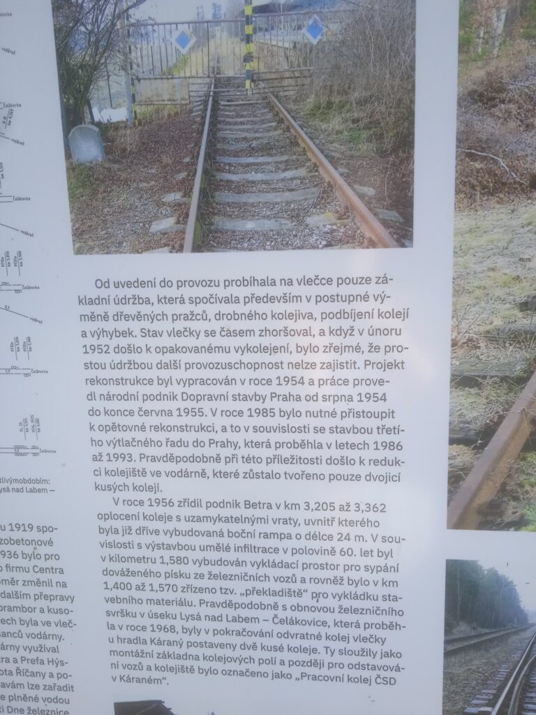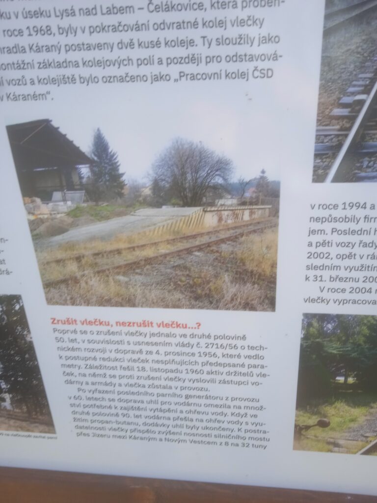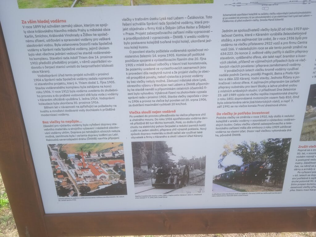A protože jsem na konci 19.století, kdy páteří hospodářského i společenského života je stále železnice, nemohla žádnému většímu závodu, ať průmyslovému či zemědělskému, nebo i tak podivně nevýrobně-výrobnímu, jako je vodárna, chybět železniční vlečka. Ta byla pro Káranskou vodárnu zřízena právě z trati Lysá nad Labem – Praha a navazovala na tuto pobočnou trať tehdejší ÖNWB (Österreichische Nordwestbahn, Rakouská severozápadní dráha) právě u poustevny sv.Václava. Dnes po ní není ani stopy, ale panely na místě ji dobře dokumentují, a protože je to navýsost zajímavá záležistost uvedeme je zde i my.