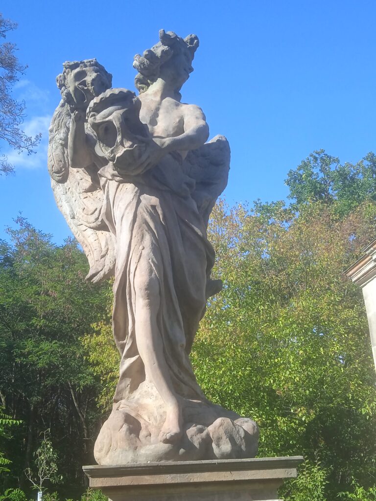 Oba jsou mohutní, štíhlí, velmi svébytní. Oba mají neurčité, nevyzpytatelné výrazy, lišící se víceméně jen pohledem – jeden hledí dolů, druhý vzhůru. Oběma rukama opět oba objímají zvláštní atribut sestávající z dutiny, v níž hraje určitou úlohu lebka. (Dnešní vylepšovatelé nevěděli nic lepšího, než právě do těchto dutin umístit červená světýlka… !) Říká se v průvodcích, že jeden má být andělem dobré a druhý špatné smrti, ale který je který?