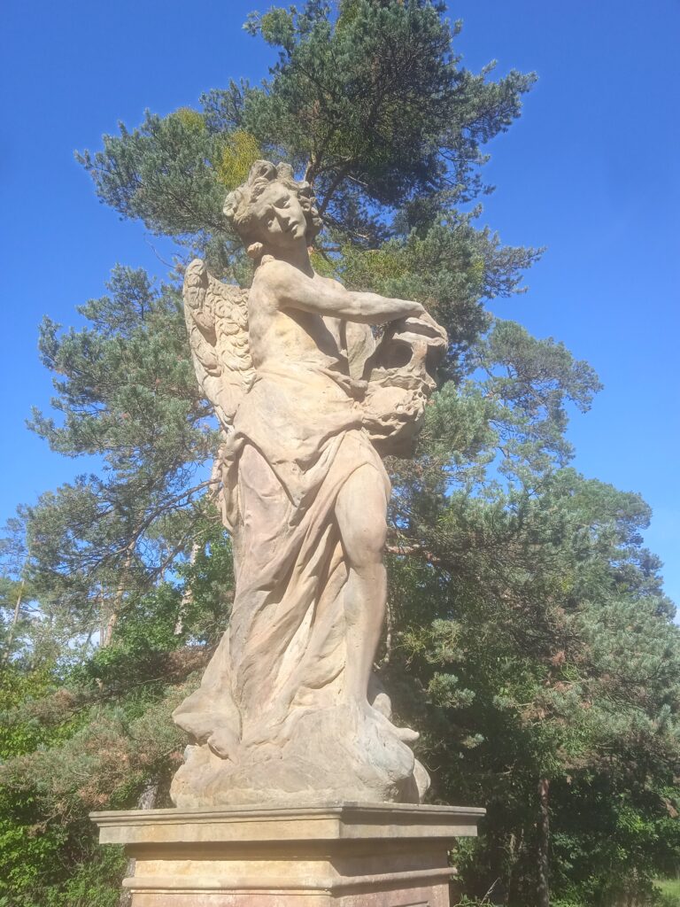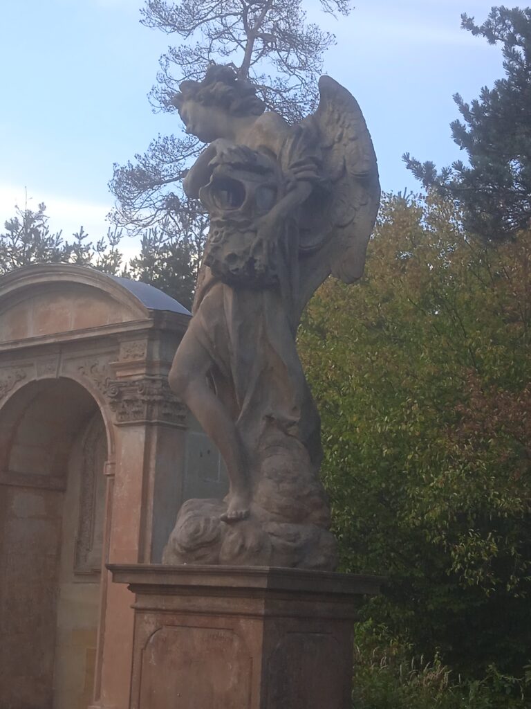 levý anděl se od pravého ovšem ani tak neliší výrazem – i on ho má velmi hloubavý – jako spíše roztančeným postoje a jeho lebka je ověnčena. On tedy bude spíše andělem oné „dobré“ smrti.